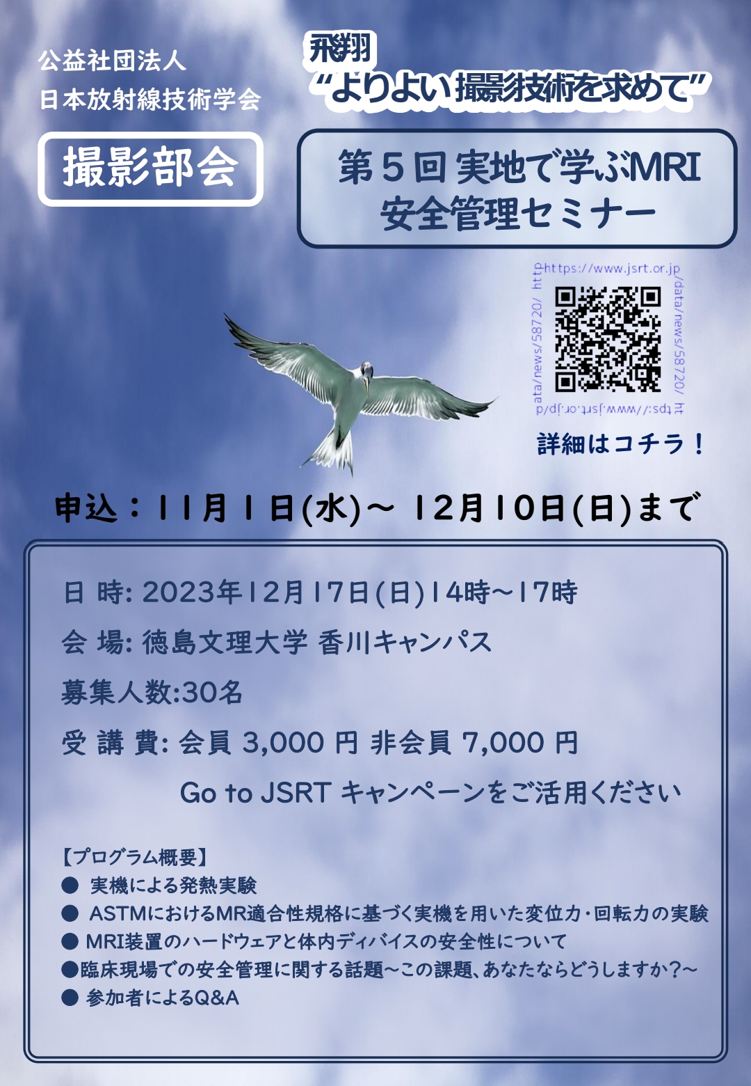 秋季大会は参加されましたでしょうか?改めて、対面開催の良さを感じました。日常業務への課題や新しい研究課題を発掘できた!という方も多いのではないでしょうか?撮影部会ではまだまた種々のセミナーを開催して参りますので、是非ご参加ください!早速ですが、第5回 実地で学ぶMRIセミナー のお知らせです?️?️?️【セミナー概要】概要事故のない安全なMRI検査を行うためには、MRI装置の物理的な特性(吸引力、トルク、発熱など)や、検査を安全に実施するために管理すべき事項を理解することが重要です。撮影部会主催で開催されるMRI安全管理セミナーは、過去3年COVID-19の影響によってWebinar開催となりましたが、この度、現地に参集した実習型のセミナーを開催できることになりました。皆様の多くのご参加をお待ちしております。