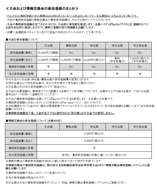 「学会・セミナー参加申請」ページから,以下名称を選択し,支払い期限(923日)までに支払い手続きをする.名称:【正会員限定】第47回日本放射線技術学会秋季学術大会【事前参加登録】