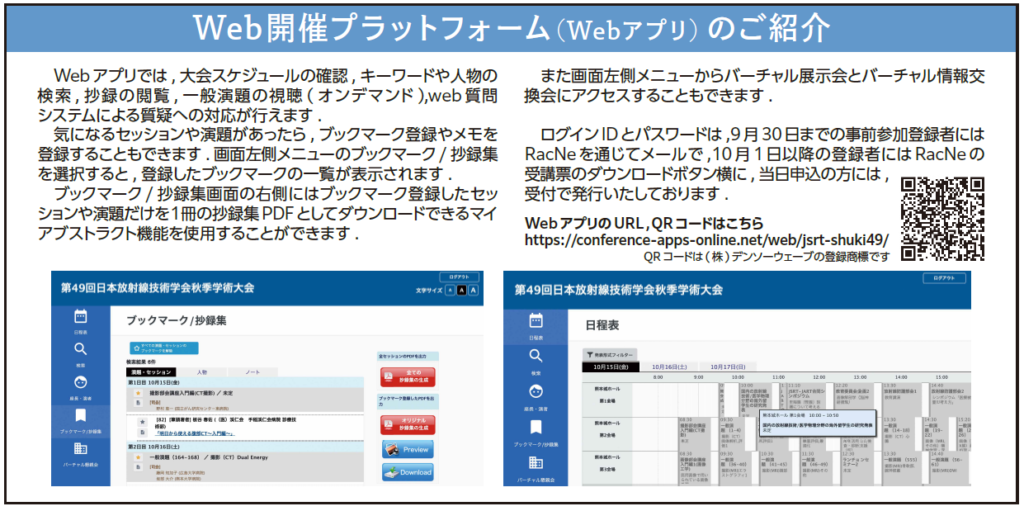 Webアプリでは, 大会スケジュールの確認,キーワードや人物の検索, 抄録の閲覧,一般演題の視聴( オンデマンド),web質問システムによる質疑への対応が行えます.