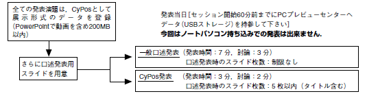 全ての採択演題は,「一般口述発表」または「CyPos発表」の形式で,口述の発表をしていただきます.ただし,それぞれ発表の形式が異なりますので,必ず下記の事項に目を通して下さい.