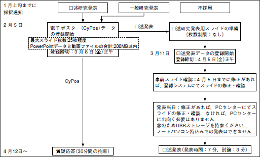 採択された方は全員2月5日(火)から3月8日(金)正午までに電子ポスター(CyPos)を大会ホームページの電子ポスター(CyPos)登録サイトから登録してください.3月8日以降はデータの変更はできません. |