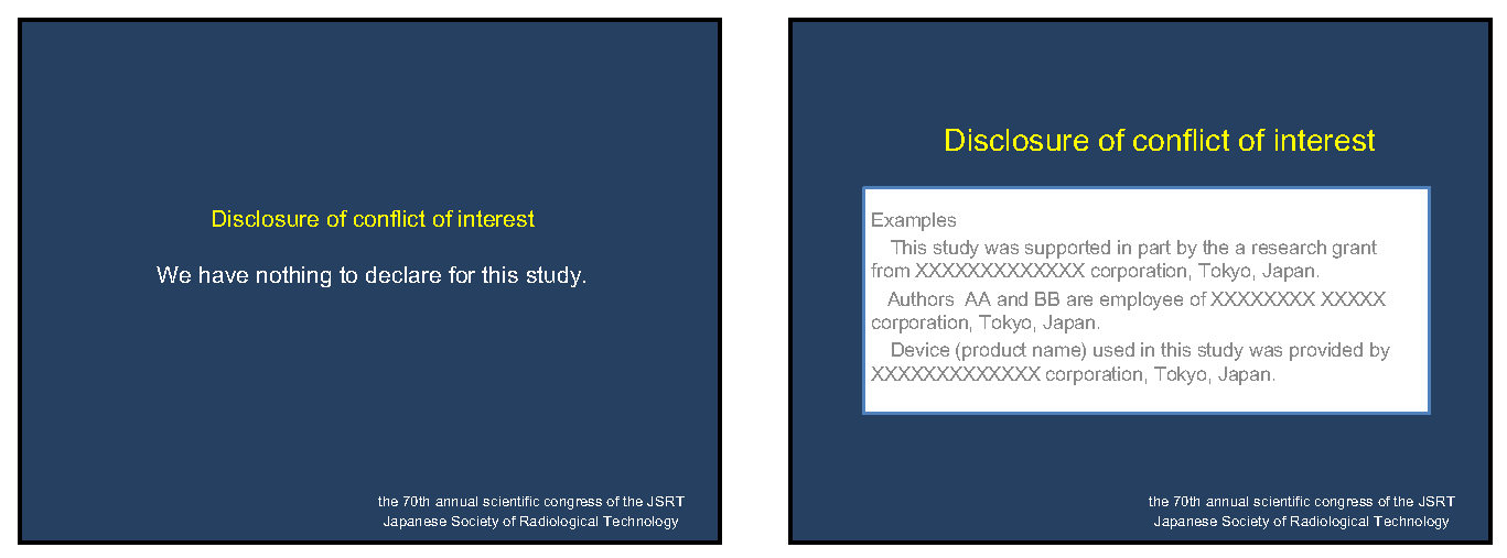 - A slide of conflict of interest (COI) disclosure for all authors(incl. presenting author and co-author(s)) whether they have a state of COI or not, should be included in both your electronic poster (CyPos) and oral presentation slides.The JSRT strongly recommend all presenters to report the disclosure statement for COI including financial and/or technical supports.