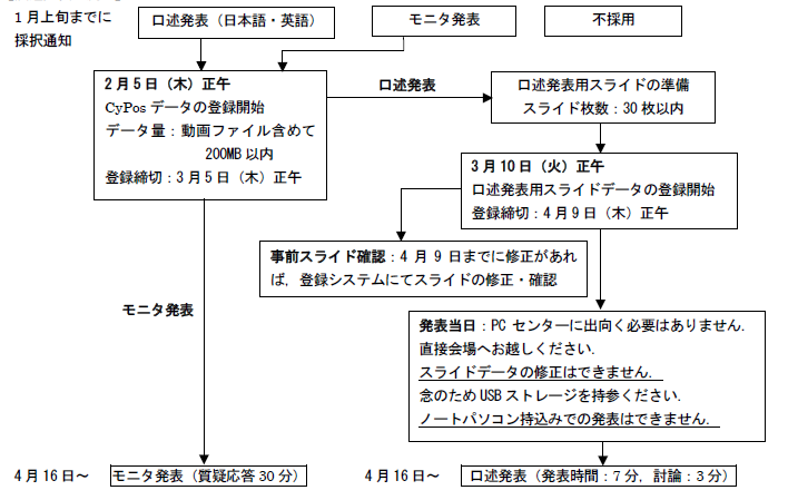 | 6. | 「口述発表」「英語口述発表」ではなく「モニタ発表」になった方は,質疑応答となります.事前に登録されたCyPos用スライドで行われます.なお,登録後3月5日以降はスライドデータの変更はできません. | |