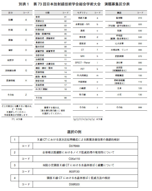 別表1 第73回日本放射線技術学会総会学術大会 演題募集区分表