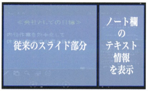 モニタ画面の左側にはスライド部分が表示され,右側にはPowerPointノート欄のテキスト情報を表示します.