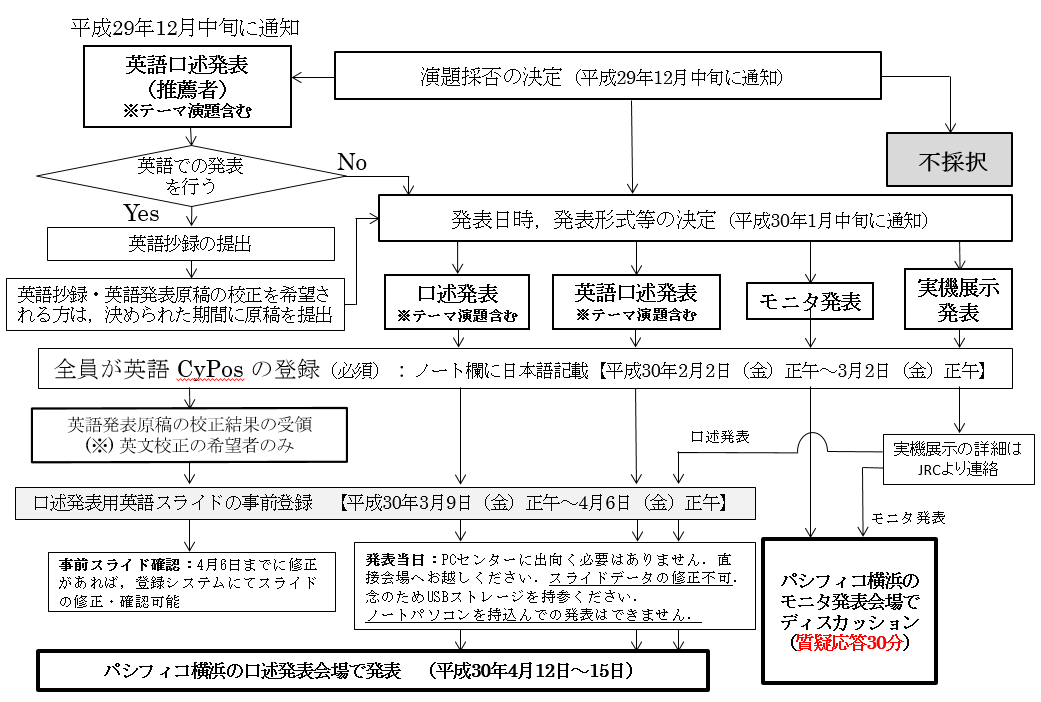 採択された方は,平成30年2月2日(金)正午から3月2日(金)正午までにCyPos用スライドを大会ホームページ “発表者の皆様へ” から事前に登録してください. |