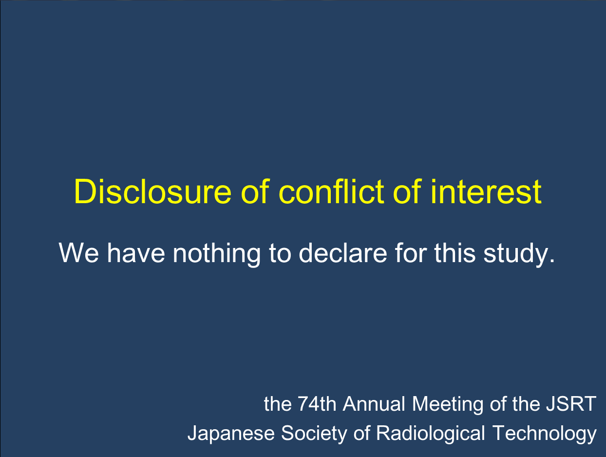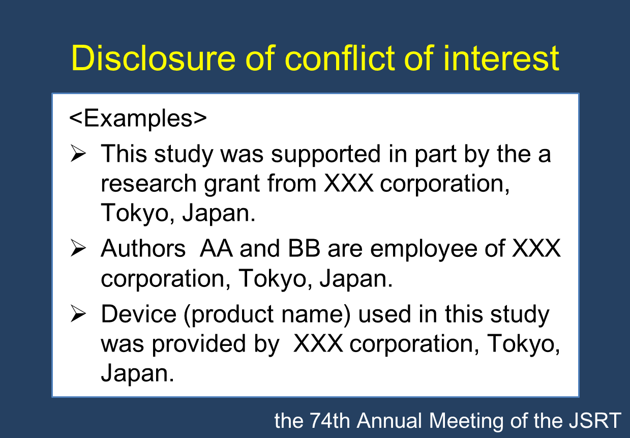 A slide of conflict of interest (COI) disclosure for all authors (incl.presenting author and co-author(s)) whether they have a state of COI or not,should be included in both your electronic poster (CyPos) and presentation slides.