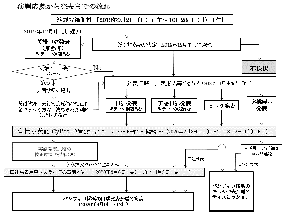 | 演題採択者のCyPos登録(予定) | 2020年2月3日(月)正午 | 2020年3月2日(月) 正午 |