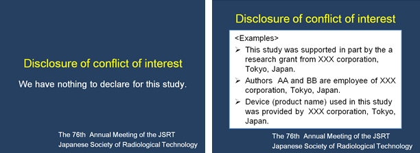 | 発表する研究に関連して,企業等からの補助や援助を受けている場合(過去1年間に10万円相当以上),または,応募演題に関係する企業の被雇用者が共同研究者に含まれる場合は,その事実を開示する義務があります.演題応募時は利益相反の有無に関する質問に必ずお答えください.詳細は,本学会倫理規程および研究の倫理審査における倫理規程の運用内規をご覧ください.本件は2008年3月に厚生労働省が示した指針(厚生労働科学研究における利益相反(Conflict of Interest:COI)の管理に関する指針)に従い,本学会においても研究の公正性,信頼性を確保するために利害関係が想定される企業等との関わり(利益相反)について適正に対応することを念頭においています. 利益相反の公開方法は,電子ポスターおよび口述発表用スライドの2枚目(1枚目はタイトル,施設名等)にスライドを挿入することとします. 下記に示すサンプルスライドを大会ウェブサイトからダウンロードできるよう準備します. |