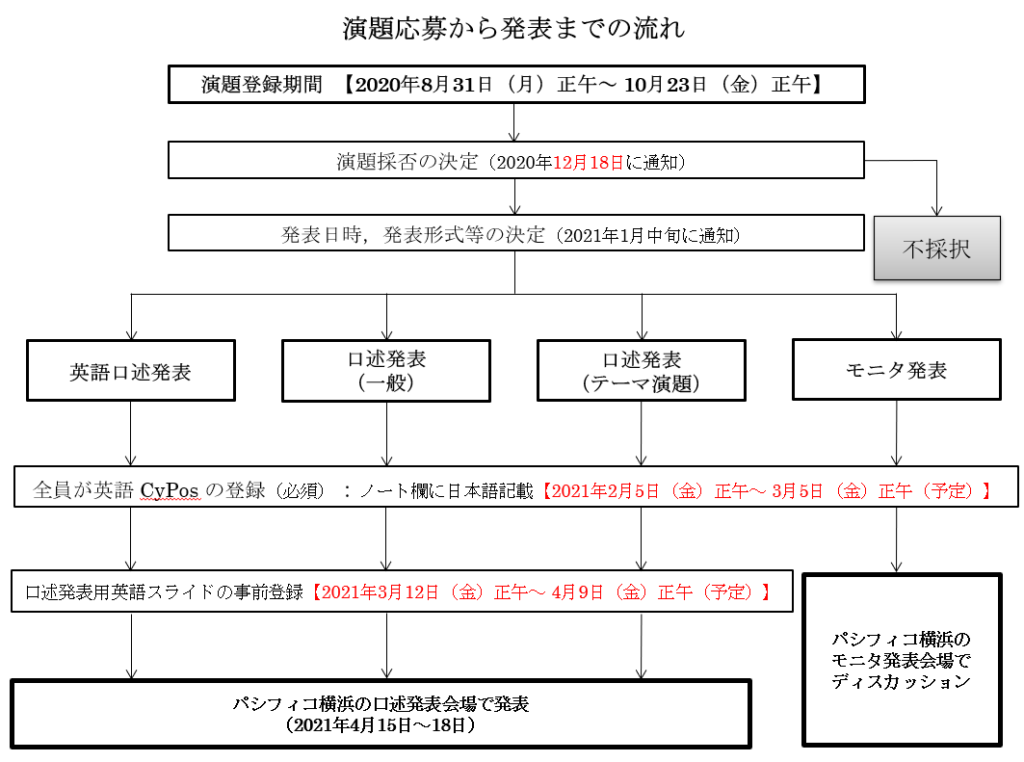 - 口述発表(発表時間:7分,討論:3分)またはモニタ発表(質疑応答:30分)の発表区分は,プログラム委員会による審査によって決定し,1月中旬に電子メール(オンライン登録に使用したメールアドレス)にて通知します.