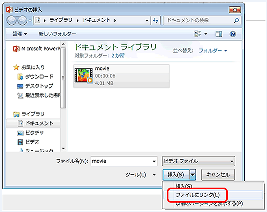 - ビデオの挿入ウィンドウ内の「挿入」ボタンの下向き矢印をクリックし、[ファイルにリンク]をクリックします。