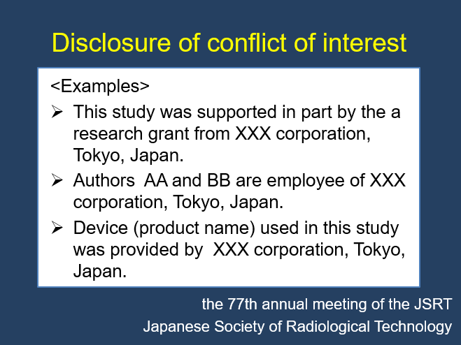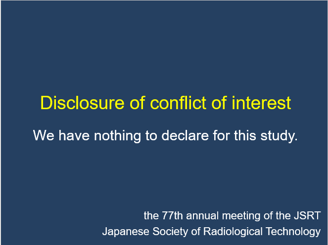 JRC2021では、すべての発表者に利益相反の開示が義務づけられております。発表者は、CyPosスライドの2枚目(タイトルスライドの次)に利益相反に関するスライドを必ず入れてください。