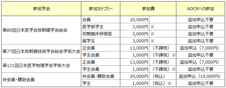 - 上表で「追加申込不要」と記載されたカテゴリーの参加者は、追加登録なしでAOCRにも参加可能です。