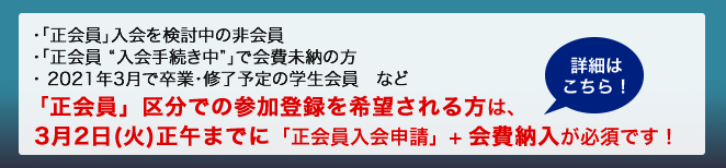 なお今年3月で卒業・修了される学生は、「学生」区分での参加登録はできません。「正会員」区分で参加希望の方は下記をご覧ください。
