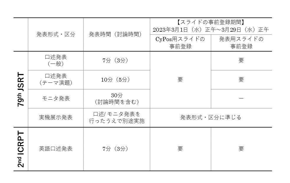 【表をクリックすると拡大します】 - 発表形式・区分は,演題登録時の希望を加味してプログラム委員会の審査で決定し,演題申し込み時に登録されたアドレス宛に電子メールで通知します(2023年1月16日に通知予定).