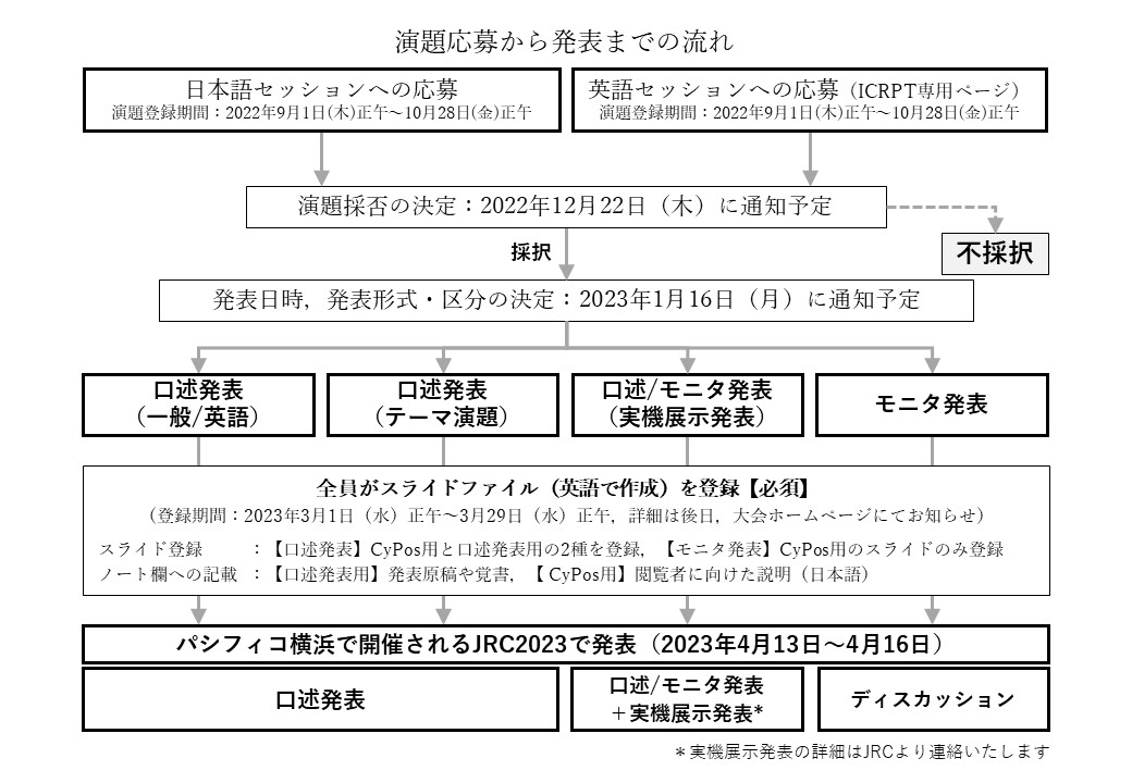 *ICRPTでは英語で詳しい説明文を記載ください. - モニタ発表で採択された場合は,CyPos用のスライドファイルのみを事前に登録します.