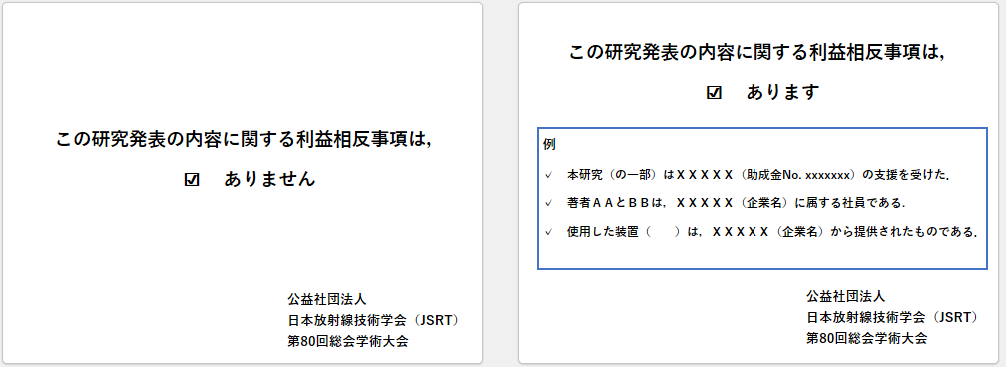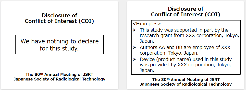 研究者は,「厚生労働科学研究における利益相反(Conflict of Interest:COI)の管理に関する指針」および「日本医学会COI管理ガイドライン2022」に準拠し,研究の公正性,信頼性を確保するために,利害関係が想定される企業等との関わり(利益相反)について適正に対応する必要があります.JRC2013以降,利益相反に関するスライドを挿入する方針が定まり,第70回総会学術大会以降,表示を義務付けることとなりました.利益相反の公開方法は,発表スライドの2枚目(1枚目はタイトル,施設名等)にスライドを挿入することとします.下記に示すサンプルスライドをご参照ください・