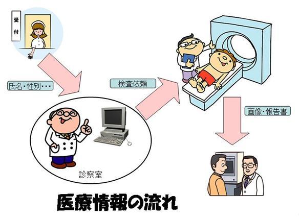 放射線部門における医療情報としては、検査依頼情報(患者さんの氏名、性別、検査目的)、検査結果(レントゲン画像、3D画像、画像診断報告書など)など が挙げられ、今では紙やフィルムといった物理媒体ではなく電子媒体で取り扱われ、院内の診察室などにはじまり、近隣の診療所や病院などの他の医療機関と 様々なやり取りが行われています。
