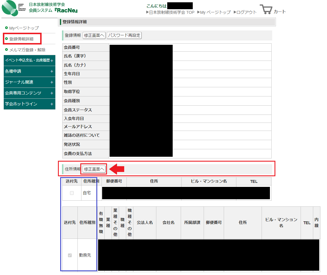 3 登録情報詳細ページの「住所情報 【修正画面へ】」コーナーの【修正画面へ】ボタンをクリック