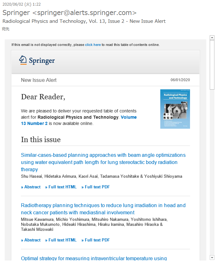 RPT誌を出版しているシュプリンガー・ネイチャー社では,各号の発行時に,その内容をメールでお知らせするサービスを行っています.(RPTの発刊月である1、3、6、12月に配信予定)