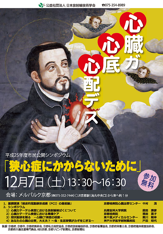 本シンポジウムは,一般市民を対象として虚血性心疾患のうち狭心症に注目して,早期発見のための検査,低侵襲な治療ならびに予防についての解説を行います.基調講演として狭心症を含む虚血性心疾患の概要を解説するとともに,比較的侵襲の軽微な治療法の一つである経皮的冠動脈形成術(PCI)について,実際の方法を交えながら分かりやすく解説した後で,各分野の専門家によるシンポジウムを開催します.最初に,心臓カテーテル検査における放射線被ばくを取り上げます.検査・治療時の被ばくの程度と低減技術を紹介して,放射線についての正しい知識をふまえて上手に利用することの大切さを理解してもらいます.続いて,心臓カテーテル検査チームの主要な一員である看護師の立場で,安心して検査を受けてもらうための取り組みについて説明します.さらに,主に冠状動脈の異常な血管を見つける目的で行う造影剤を使った心臓CT検査の実際について解説します.最後に,狭心症に罹らないための生活習慣の改善方法について具体的に解説します.シンポジウムの最後には,総合質疑応答の時間を設けて会場からのご質問にできる限り回答します.