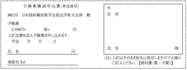 別途購入を希望される場合は,下記の「予稿集購読申込書」(コピー)を同封のうえ,必ず現金書留にて下記宛にお申し込みください.一冊2,100円(税込み),送料は無料です. |