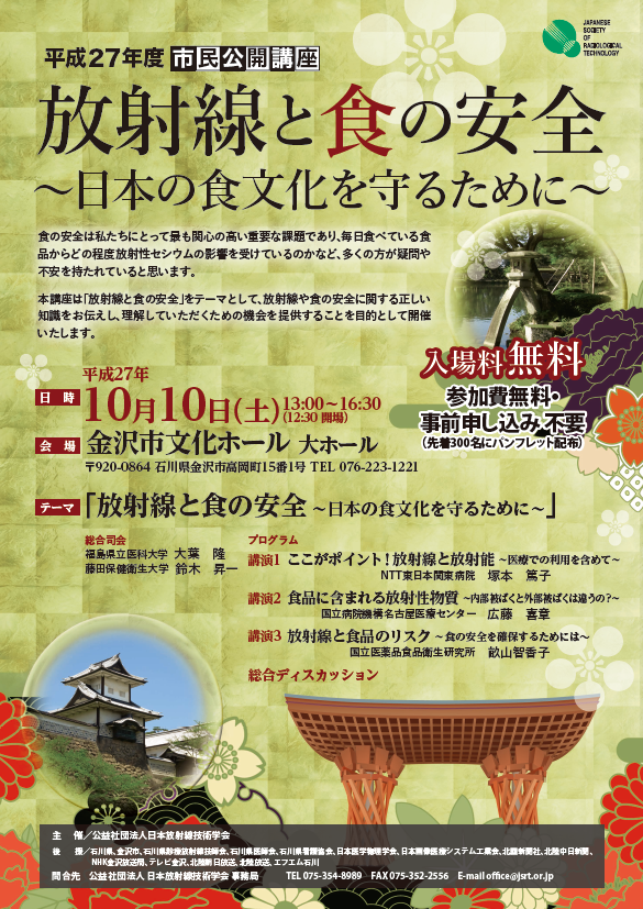 本講座は「放射線と食の安全」をテーマとして,食の安全について分かりやすく解説しつつ,放射線・放射能に対する正しい知識を伝え,理解していただくための機会を提供することを目的として開催いたします.