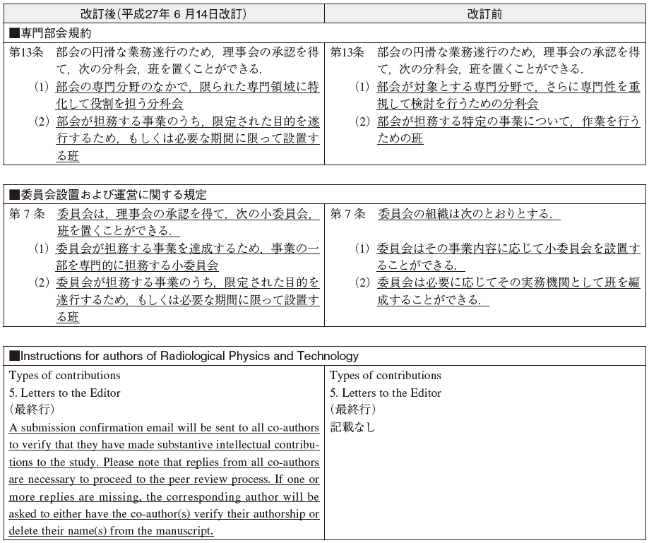 平成27年度第3回理事会(平成27年6月14日開催)にて,以下の通り諸規約・諸規定が一部改訂となりましたのでご案内します.なお,現行の諸規約・諸規定の全文は,ホームページの[学会について]⇒[定款および諸規約・諸規定]からご覧いただけます.