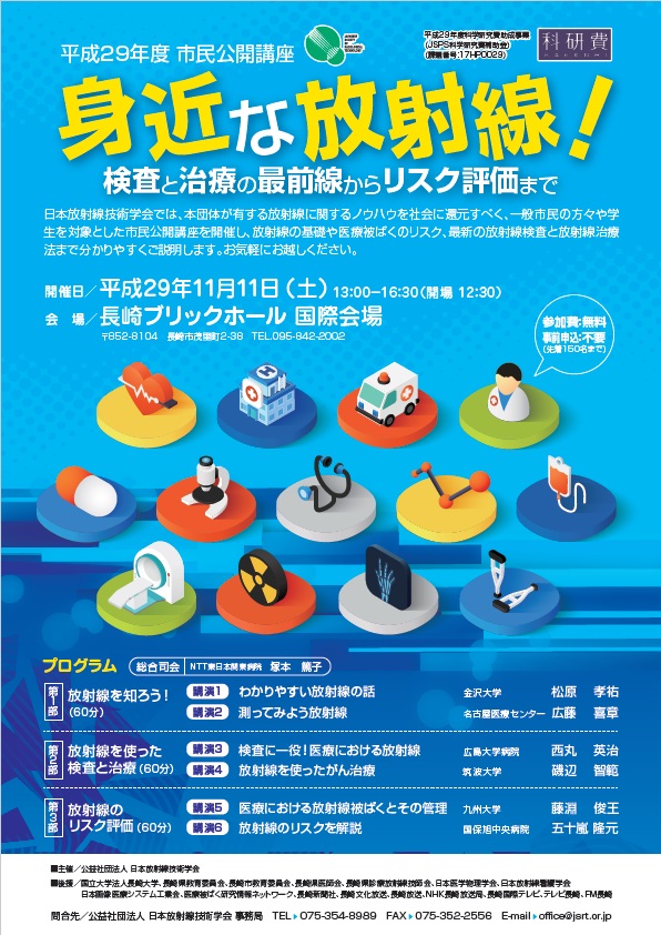 | 後援 | : | 国立大学法人長崎大学,長崎県教育委員会,長崎市教育委員会,長崎県医師会,長崎県診療放射線技師会,日本医学物理学会,日本放射線看護学会,日本画像医療システム工業会,医療被ばく研究情報ネットワーク,長崎新聞社,長崎文化放送,長崎放送,NHK長崎放送局,長崎国際テレビ,テレビ長崎,FM長崎 | ||||||||||||||||||||||||||||||||||||||||||||||