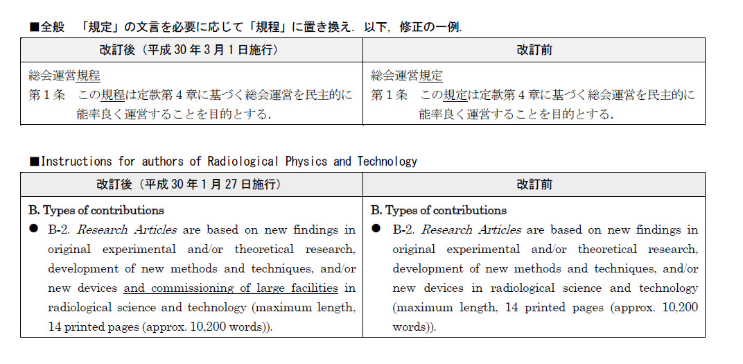 平成29年度第6回理事会(平成30年1月27日開催)にて,以下のとおり諸規約・諸規程が一部改訂となりましたのでご案内します.なお,現在施行されている諸規約・諸規程の全文は,ホームページの 学会について ⇒ 定款および諸規約・諸規定 からご覧いただけます.