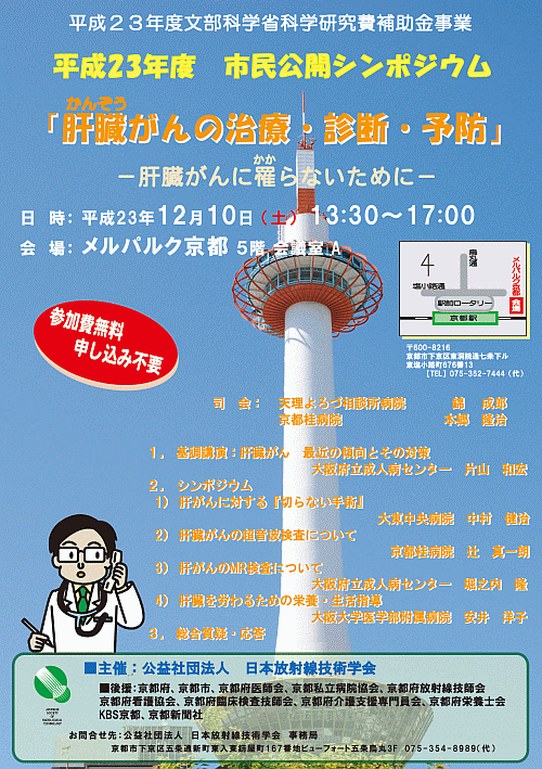 | 後援 | : | 京都府,京都市,京都府医師会,京都私立病院協会,京都府放射線技師会,京都府看護協会,京都府臨床検査技師会,京都府介護支援専門員会,京都府栄養士会,KBS京都,京都新聞社 | ||||||||||||||||||||||||