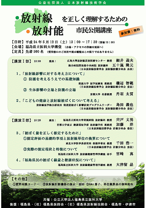 本学会では,市民の皆様に放射線・放射能について正しく理解していただくための市民公開講座を昨年,福島市と東京都で開催しました.本年も継続して福島市で開催することとしました.放射線の健康影響や自分自身が被ばくを少なくする方法など,日々の生活の中で皆様に役立つ情報を分かり易く提供したいと考えています.この市民公開講座が放射線に対する正しい知識を身につけていただくための一助となれば幸いです.多くの市民の皆様のご参加をお待ちしています.