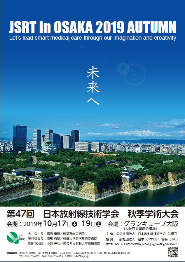 水の都,食い倒れの街,お笑いの街,大阪には色々な顔があります.第47回秋季学術大会では,皆さんへの真剣な議論の場を提供するのみではなく,心に残る学術大会にしたいと思っております.また講演や研究発表のほか,様々な大会企画を予定しております.開催日時は2019年10月17・18・19日です.大阪の真ん中で放射線技術学の未来の話をしましょう!