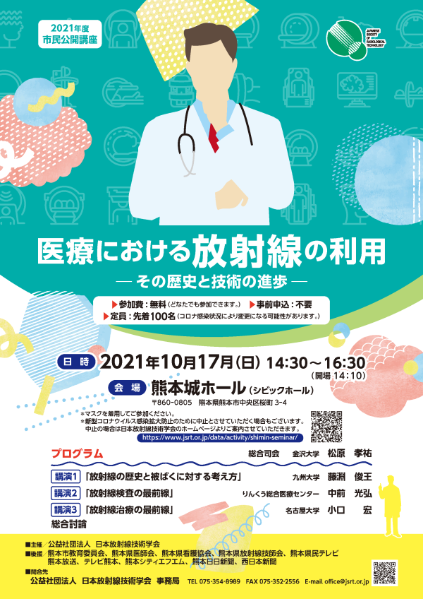 放射線は現在の医療において欠かすことのできないものとなっており,診断から治療まで幅広く使用されています.医療現場における放射線のスペシャリストとして,様々な放射線装置を取り扱い,また管理する診療放射線技師について,患者として放射線診療に係る一般市民の方や中学・高校で放射線教育を担われる理科教員,および医療職を目指す学生に,放射線診療に対する理解の促進を図ることを目的に,第49回秋季学術大会 最終日,熊本城ホールにおいて,市民公開講座を開催いたします.