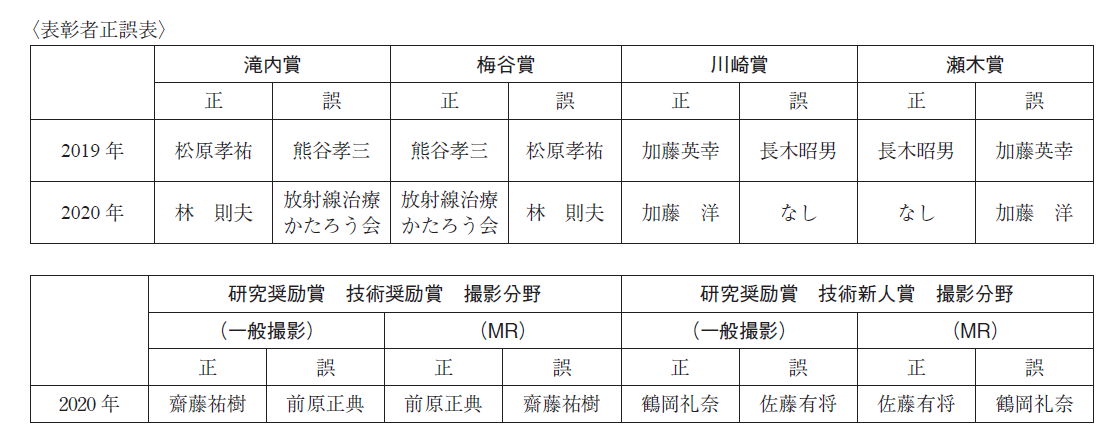 | 研究奨励賞 技術新人賞 撮影分野(一般撮影) (正)鶴岡礼奈 (誤)佐藤有将 | ||