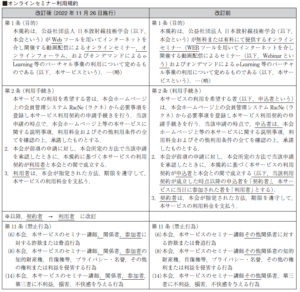 2022年度第4回理事会(2022年11月26日開催)にて,以下のとおり諸規約・諸規程が一部改訂となりましたのでご案内します.なお,現在施行されている諸規約・諸規程の全文は,ホームページの 学会について⇒定款および諸規約・諸規程 からご覧いただけます