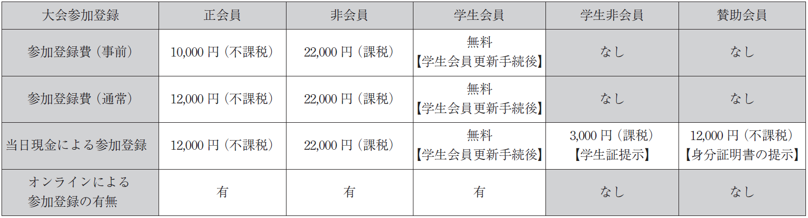| ※ | 前年度から学生会員の方で,今年度の学生会員の更新手続きを今年7月末までに完了していなかった場合,学生会員の資格が失効しているため,学生会員として参加登録はできません. | |