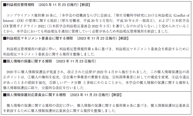 2023年度第5回理事会(2023年11月23日開催)にて,以下のとおり諸規約・諸規程が一部改訂となりましたのでご案内します.なお,現在施行されている諸規約・諸規程の全文は,ホームページの 学会について⇒定款および諸規約・諸規程 からご覧いただけます.