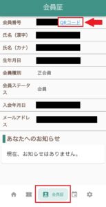 | 3 「会員証」ページが表示されます。 → 右上の「QRコード」をクリック |