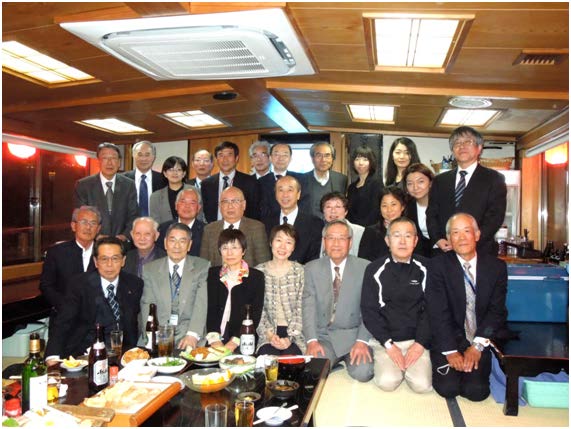 昨年の学術大会は震災の影響で変則開催となり、FAR会懇親の夕べも仕切り直し開催となった。生憎の雨が降りしきる中で19時30分に学会場横の「ぷかり桟橋」を出港し、賑やかに懇親が始まった。屋形船の真ん中のテーブルには大漁大船盛、金目鯛の煮つけ等が一杯に並ぶ中、ビール・日本酒・焼酎で盛り上がり、萩原先生差し入れの高級ワインも好評でした。テーブルには揚げ立ての天麩羅等、食べ切れないほどの料理が次々と運ばれる中、事務局の寺本嬢による美声のカラオケが始まると草山先生・山田先生も負けずに参加され、大盛り上がりとなりました。多くの皆さんからのご祝儀もいただき、感謝します。