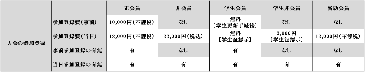 - Web参加登録できるのは正会員と学生会員で,参加登録費は正会員10,000円(事前登録9月末日まで,不課税),12,000円(通常登録10月1日以降会期終了まで,不課税),学生会員無料です.