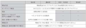 講演者の方も,現地発表が出来ない場合に限り,会場からの質問に対してオンラインで回答をしていただきます.現地発表ができない講演者は,セッション開始時間の20分前までに指定されたウェビナー会場へ入室してください.ウェビナー会場(Zoom)への案内は10 月上旬に会員システム『RacNe(ラクネ)』に入力された個人メールアドレス宛に行います.もしメールアドレスの変更がある場合は大会運営事務局へご連絡ください.