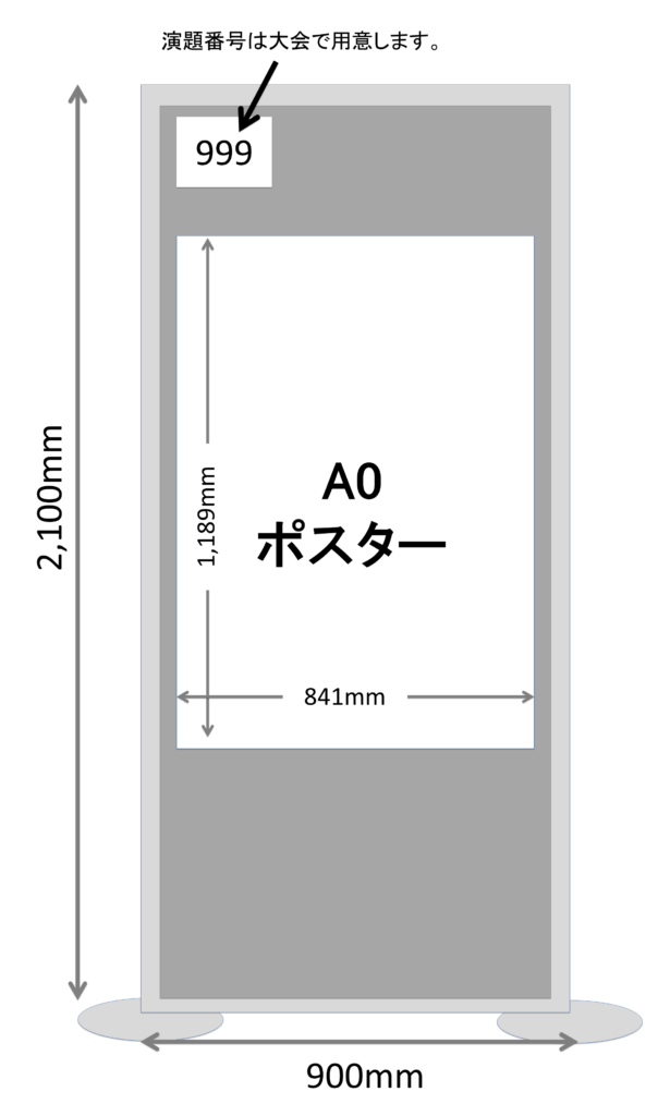 - ポスターパネルの大きさは横900mm×縦2,100mmです.ポスターパネルの貼付面に収まるようにポスターを作成してください.演題番号は大会が用意いたします.