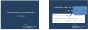 研究者は,「厚生労働科学研究における利益相反(Conflict of Interest:COI)の管理に関する指針」および「日本医学会COI管理ガイドライン2022」に準拠し,研究の公正性,信頼性を確保するために,利害関係が想定される企業等との関わり(利益相反)について適正に対応する必要があります.利益相反の公開方法は,発表スライドの2枚目(1枚目はタイトル,施設名等)にスライドを挿入することとします.下記に示すサンプルスライドをご参照ください.