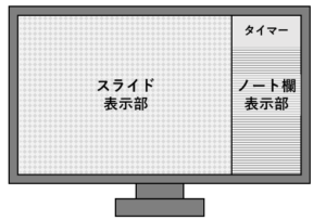 口述発表では「メモ表示機能」を使用できます.演台上に設置された発表者用モニタの左側に4:3の表示範囲にあわせたスライド,右側にノート欄とタイマーが表示されます.次のスライドを表示する機能や文字サイズの変更機能はありません.ノート欄の表示情報は発表者用のモニタにのみ表示され,座長用モニタと会場スクリーンにはスライド表示部の情報のみが表示されます.