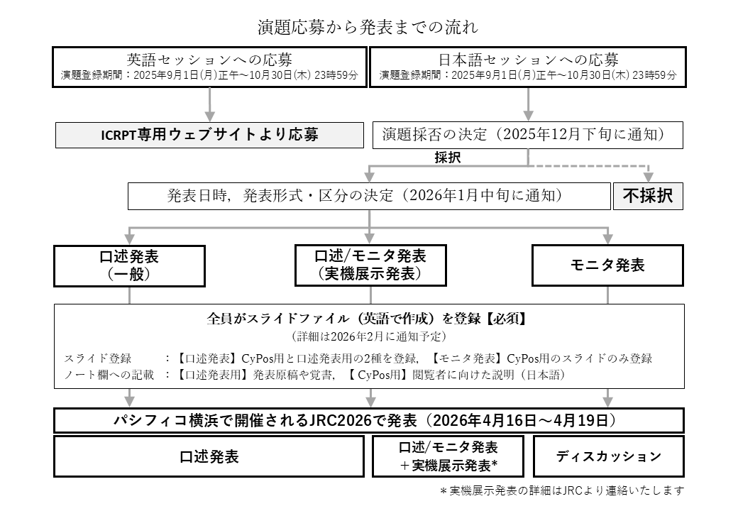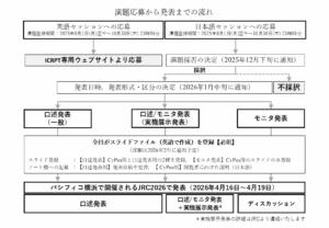 発表形式・区分は,演題登録時の希望を加味してプログラム委員会の審査で決定し,演題申し込み時に登録されたアドレス宛に電子メールで通知します(2026年1月中旬に通知予定).