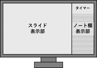 口述発表では「メモ表示機能」を使用できます.演台上に設置された発表者用モニタの左側に16:9の表示範囲にあわせたスライド,右側にノート欄とタイマーが表示されます.次のスライドを表示する機能や文字サイズの変更機能はありません.ノート欄の表示情報は発表者用のモニタにのみ表示され,座長用モニタと会場スクリーンにはスライド表示部の情報のみが表示されます.